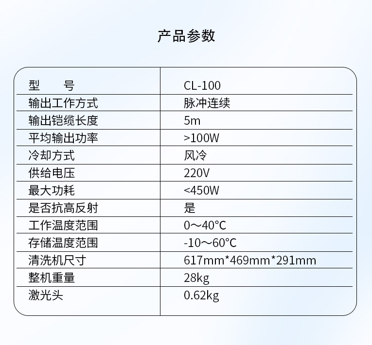 清洗機手持激光頭外觀簡潔、小巧輕便,可以長時間手持使用,按鍵與手柄一體化設(shè)計,簡單易用。內(nèi)置掃描系統(tǒng)采用小型高速電機及驅(qū)動 ,主體為一體化加工成型,堅固防塵且穩(wěn)定耐用。激光頭采用了創(chuàng)新的紅光輔助尋焦設(shè)計,可利用紅光指示輕松找到不同場 鏡下的對焦位置,解決了市場上現(xiàn)有產(chǎn)品對焦不準(zhǔn)確以及調(diào)節(jié)方式單一的問題。